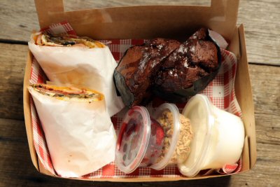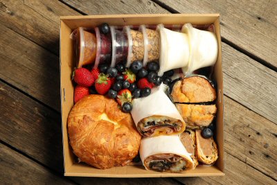 Ham and Cheese Croissants, Muffins, Breakfast Wrap, Yoghurt with Granola and Mixed Berries, Homemade Sausage Rolls with Tomato Chutney, Assorted in-season Fruits