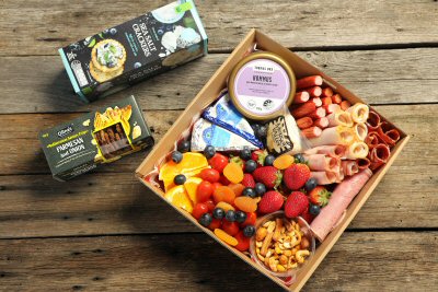 Twiggy Sticks, Assorted Deli Meats, Cheeses, Crackers, Dip, Mixed Nuts, Assorted in-season Fruit, Dried Fruit