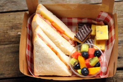 Fresh Sandwich, Assorted in-season Fruit, Caramel Slice, Passionfruit Slice